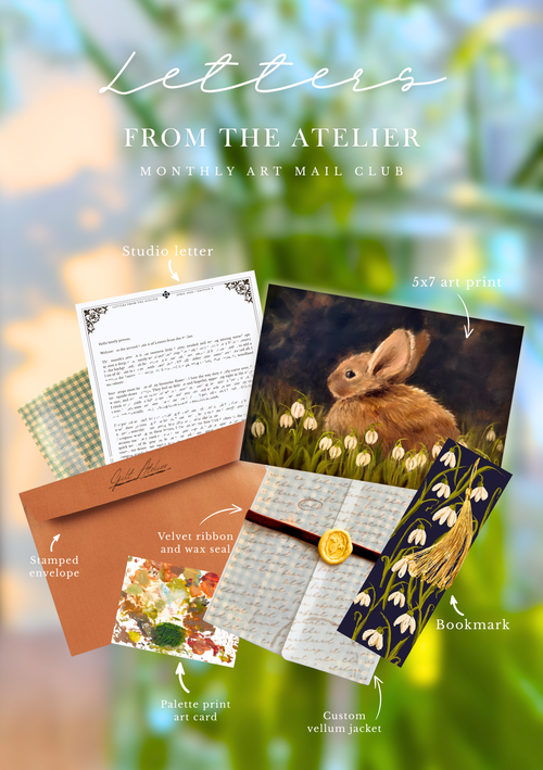 Receive a monthly art print, studio letter, and beautifully wrapped post. Worldwide shipping included.